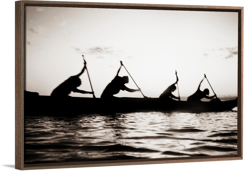 <p>Hawaii, Molokai To Oahu Canoe Race, Paddlers Silhouetted At Sunset (Black And White Photograph).</p>
