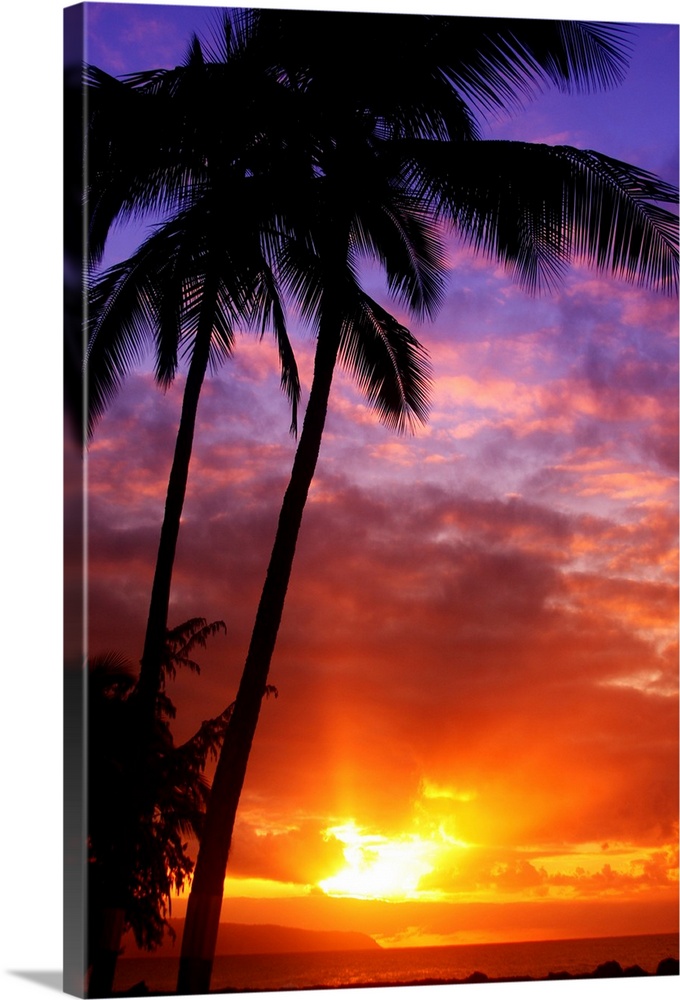 <p>Tall wall docor of silhouetted palm trees against a colorful sunset.</p>