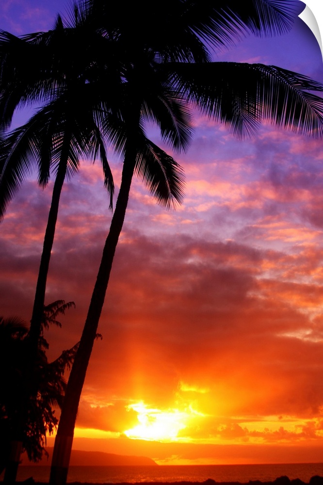<p>Tall wall docor of silhouetted palm trees against a colorful sunset.</p>