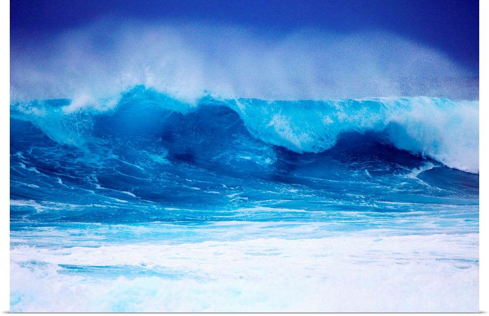 <p>Giant horizontal photograph of a vibrant blue wave spraying upward as it begins to crash onto itself, against a deep blue sky in Oahu, Hawaii.</p>