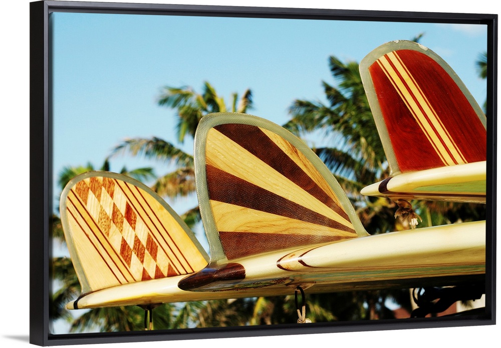 <p>Up-close photograph of three patterned surfboard fins.</p>