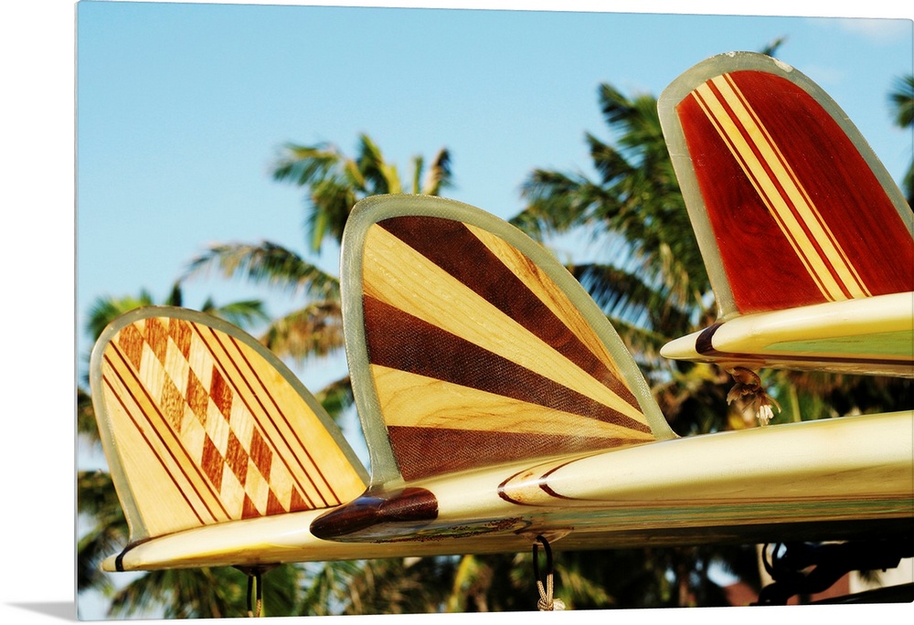 <p>Up-close photograph of three patterned surfboard fins.</p>