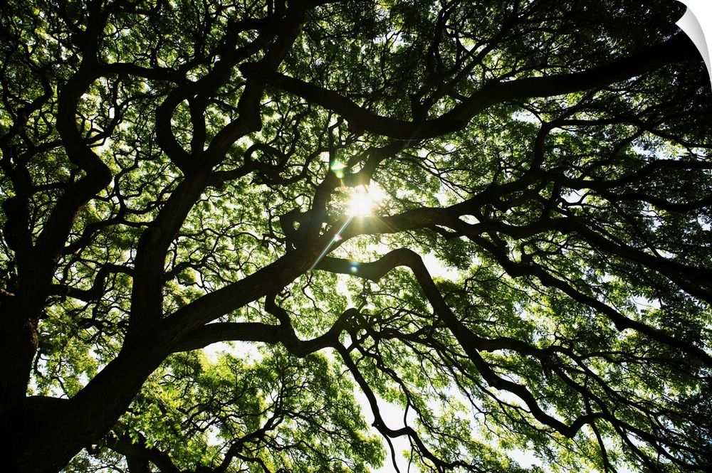 <p>Hawaii, Oahu, Huge Monkey Pod Tree With Sunlight Shinning Through Branches</p>