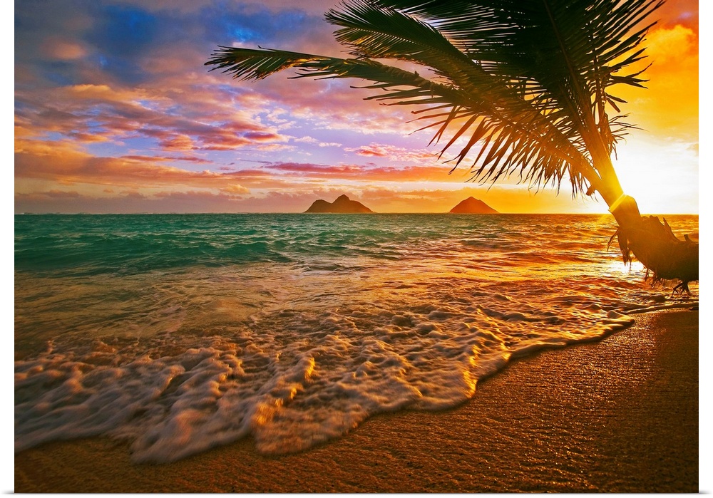 <p>Horizontal, photographic wall hanging of a palm tree swaying over the shoreline of Lanikai Beach, Hawaii during a golden sunrise.</p>