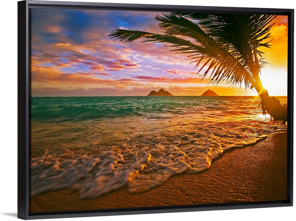 <p>Horizontal, photographic wall hanging of a palm tree swaying over the shoreline of Lanikai Beach, Hawaii during a golden sunrise.</p>