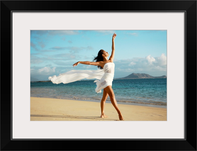 <p>Big canvas of a woman with a white sheets wrapped around her poses on a Hawaiian beach.</p>