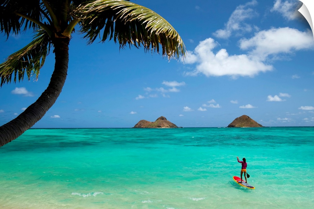 <p>Landscape photograph on a large canvas of a woman on a paddle board in the clear blue waters of Lanikai Beach, headed toward the distant Mokulua Islands. A large palm sways overhead in the foreground.</p>