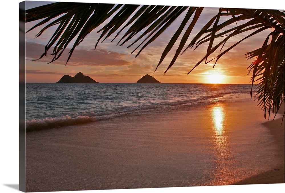 <p>Palm fronts frame this photograph of waves washing on the shore and the sun setting on the horizon of a tropical ocean scene.</p>