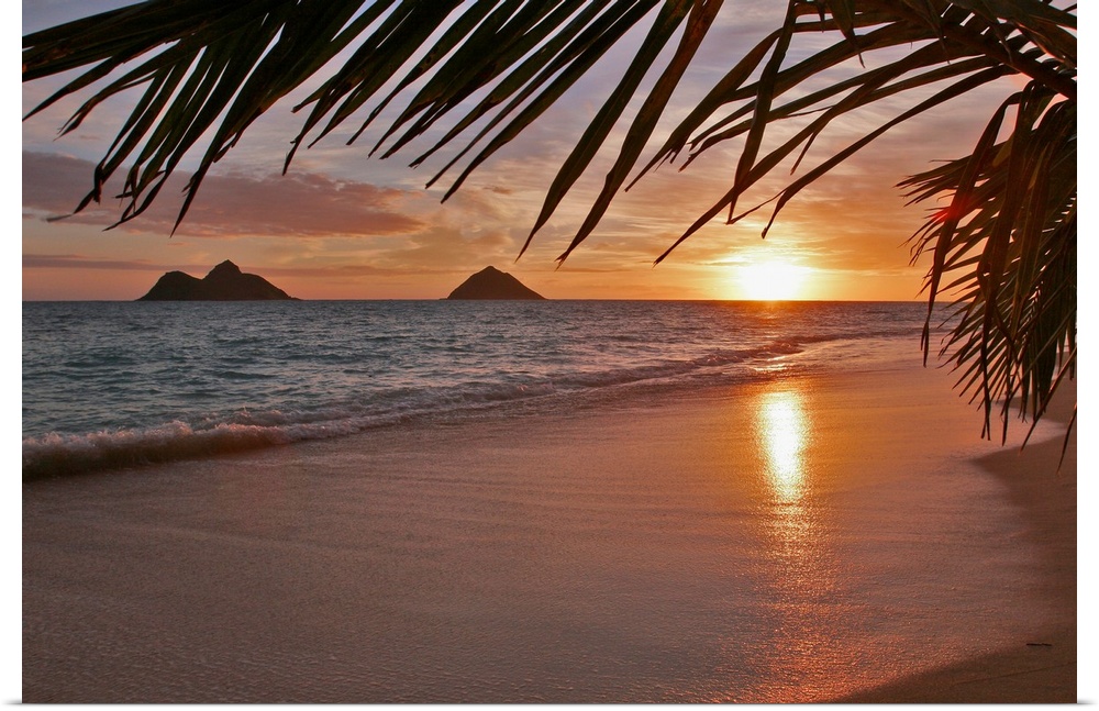 <p>Palm fronts frame this photograph of waves washing on the shore and the sun setting on the horizon of a tropical ocean scene.</p>