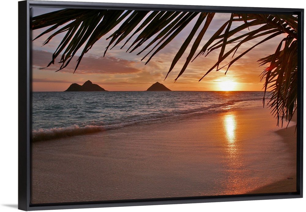 <p>Palm fronts frame this photograph of waves washing on the shore and the sun setting on the horizon of a tropical ocean scene.</p>