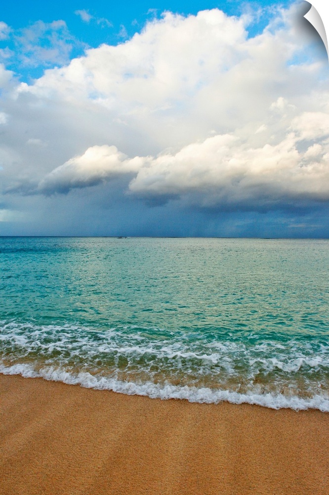 <p>This photograph is taken on a beach in Hawaii of immense clouds that hang in the sky over a teal colored ocean.</p>