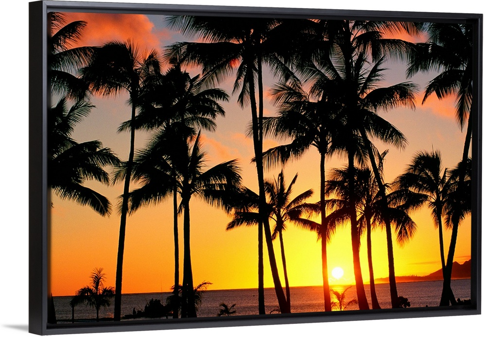 <p>The sun peeks through the palm trees as it sits inches above the horizon creating a firey sky lighting up the beach and ocean in Oahu.</p>