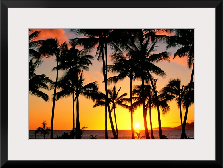 <p>The sun peeks through the palm trees as it sits inches above the horizon creating a firey sky lighting up the beach and ocean in Oahu.</p>