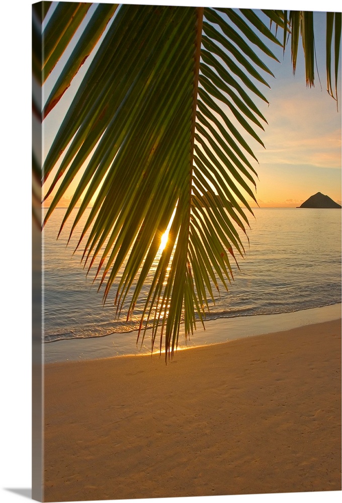 <p>Vertical photograph of a palm frond hanging low on a beach and partially obscuring the view of the sea and sunset in Oahu, Mokulua Islands, Hawaii (HI).</p>