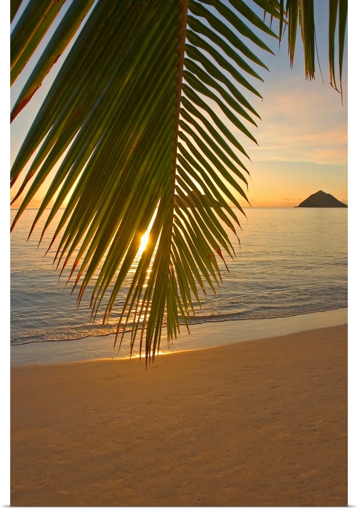 <p>Vertical photograph of a palm frond hanging low on a beach and partially obscuring the view of the sea and sunset in Oahu, Mokulua Islands, Hawaii (HI).</p>