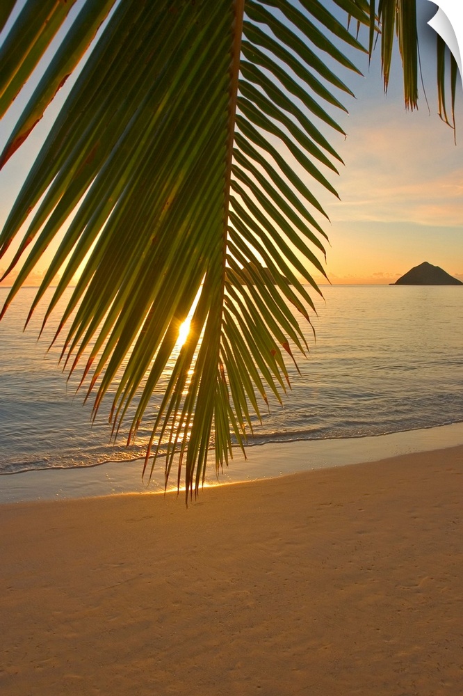 <p>Vertical photograph of a palm frond hanging low on a beach and partially obscuring the view of the sea and sunset in Oahu, Mokulua Islands, Hawaii (HI).</p>