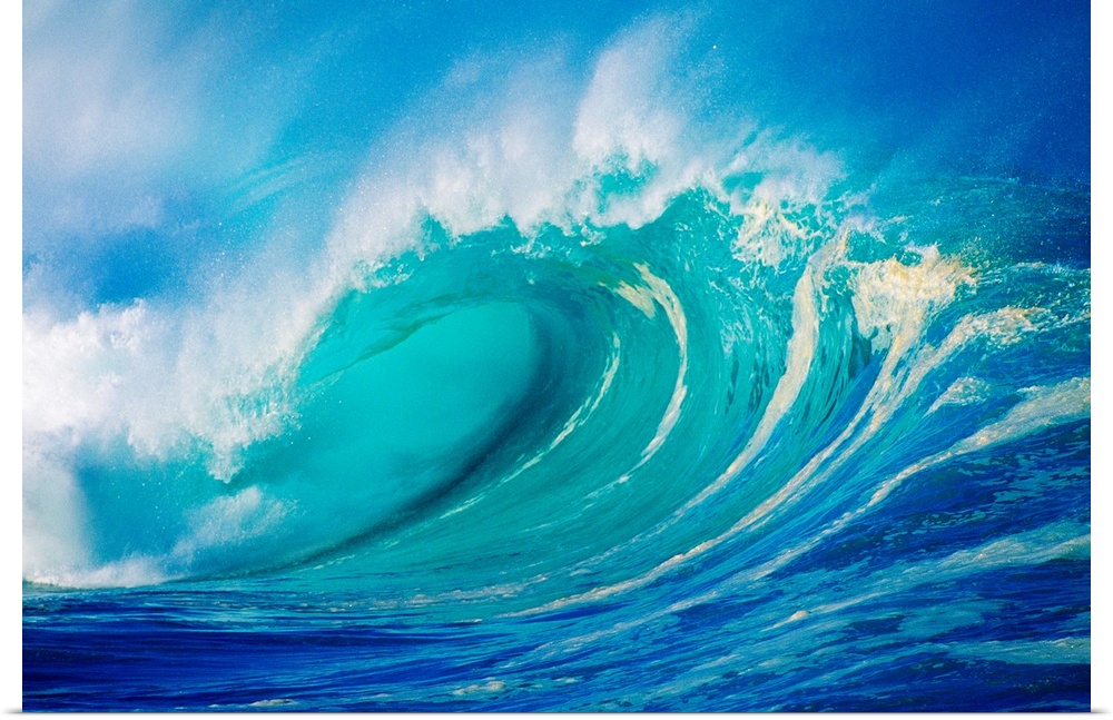 <p>Big photograph showcases a giant wave after it has curled and now prepares to break against the sandy shoreline of an island within the Pacific Ocean. As the wave prepares to break, large amounts of water vapor break apart from the top of the wave and slowly fall back into the ocean.</p>