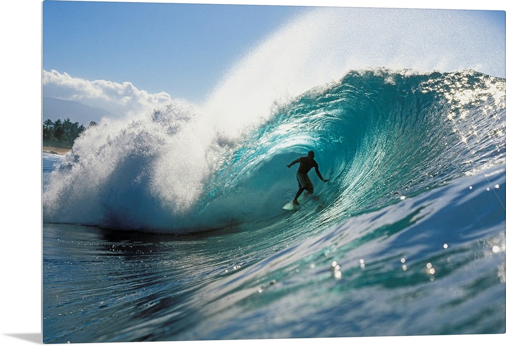 <p>Oversized, landscape photograph of a surfer riding down the center of Pipeline Wave, in the blue waters of North Shore, Oahu in Hawaii.</p>