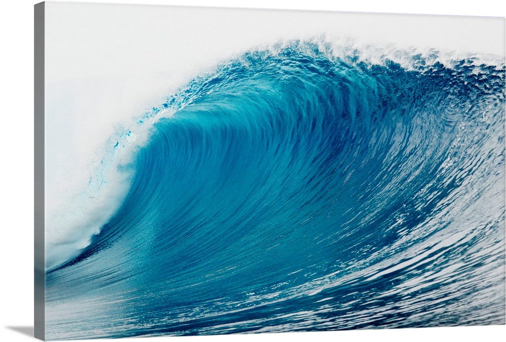 <p>A large wave is photographed as it begins to curl and break in the ocean.</p>