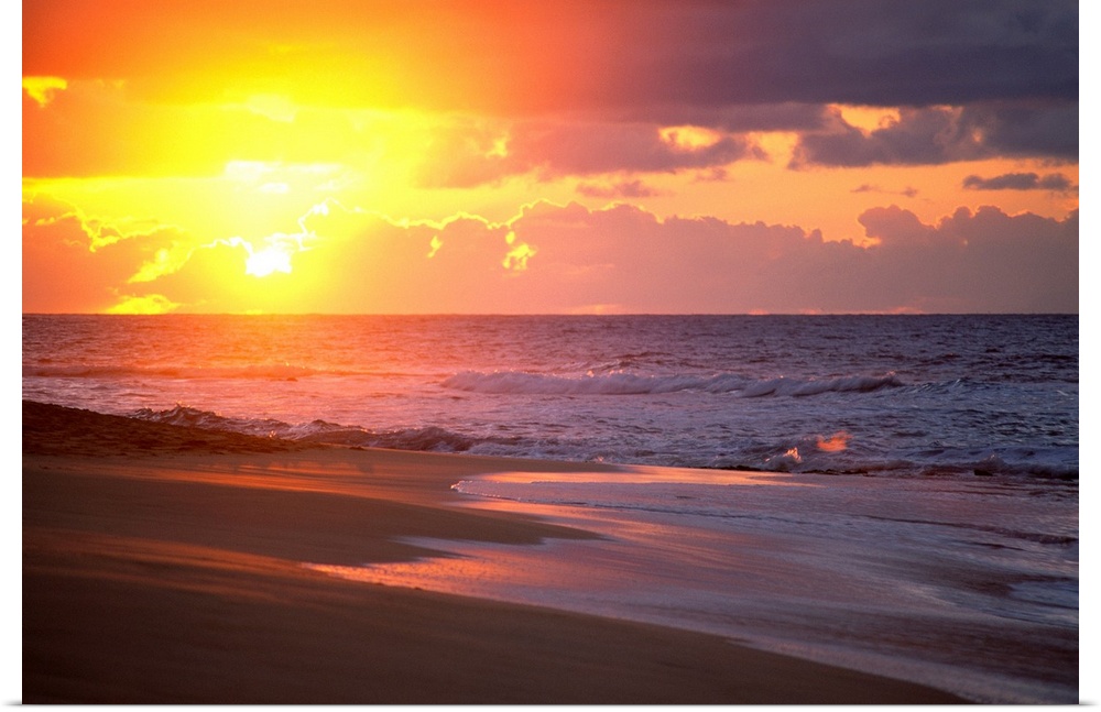 <p>Big canvas print of waves crashing on to a beach with the sun rising in the background.</p>