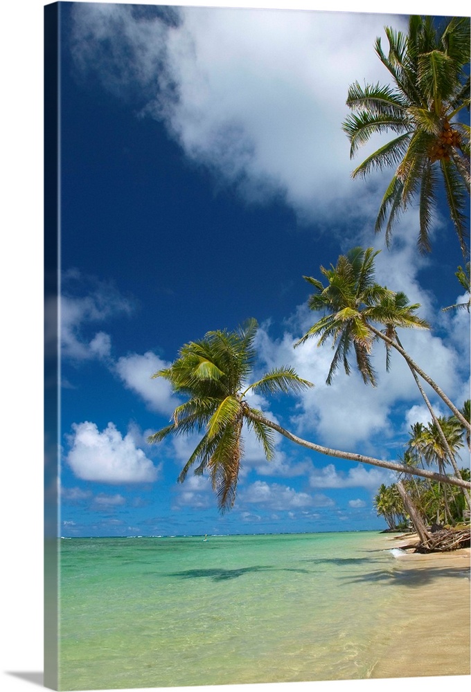 <p>This large vertical piece consists of several palm trees that stretch over crystal clear ocean water.</p>
