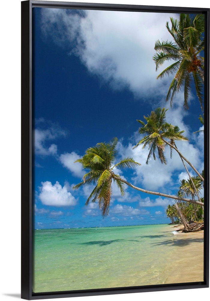 <p>This large vertical piece consists of several palm trees that stretch over crystal clear ocean water.</p>