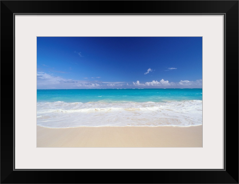 <p>Horizontal photograph on a big canvas of bright turquoise ocean water, crashing into the sand on a beach in Hawaii, beneath a bright blue sky.</p>