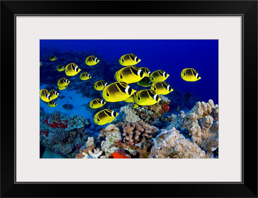 <p>Photograph of colorful school of fish underwater swimming over reef.</p>