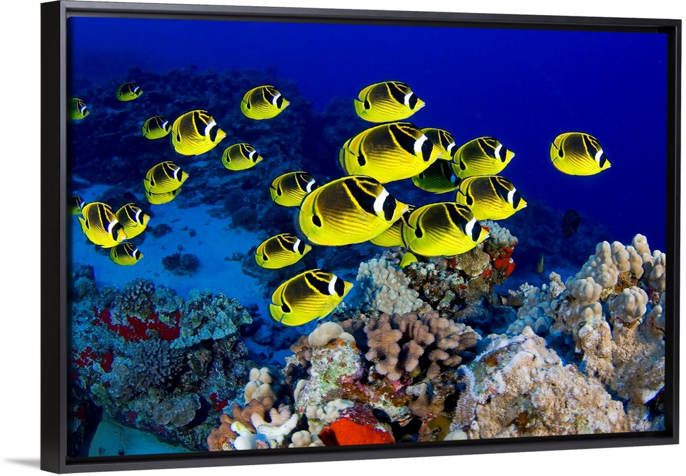 <p>Photograph of colorful school of fish underwater swimming over reef.</p>