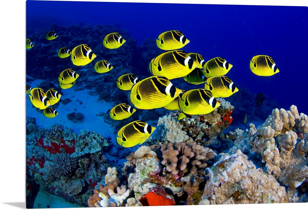 <p>Photograph of colorful school of fish underwater swimming over reef.</p>