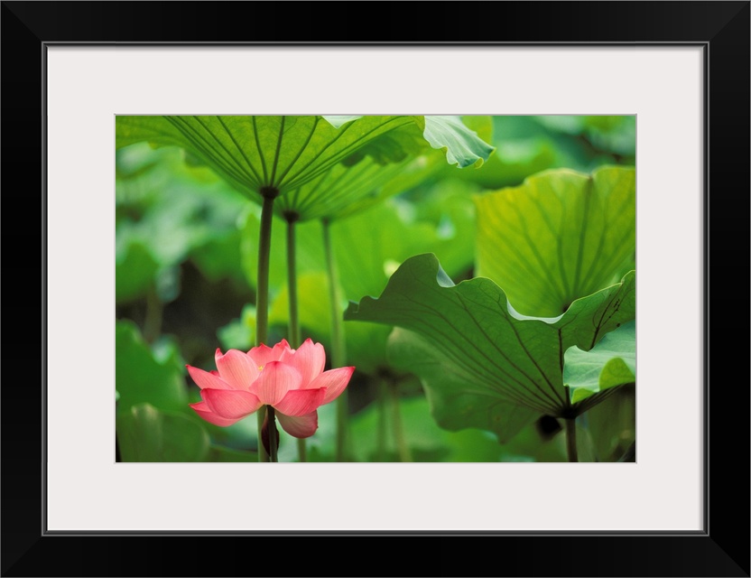 <p>Canvas photo art of a flower amounst big leaves.</p>
