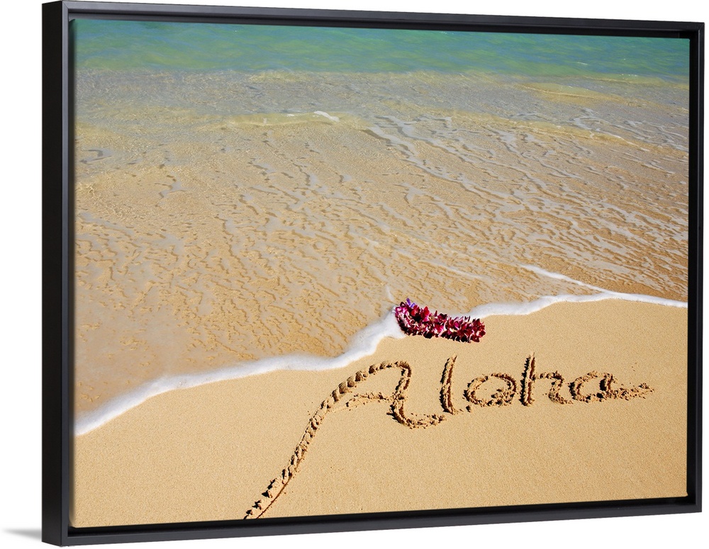 <p>Hawaii, Turquoise ocean waters, foaming shore water, orchid lei, Aloha written in sand</p>