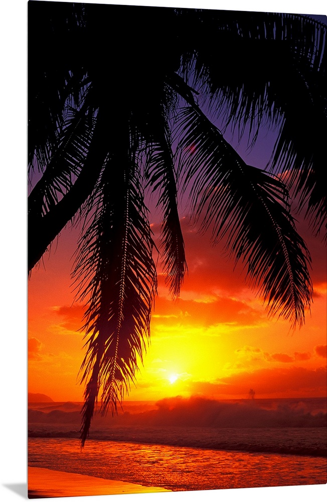 <p>Vertical, large photograph of the silhouette of a palm tree swaying over the shoreline in Hawaii, at sunset.</p>