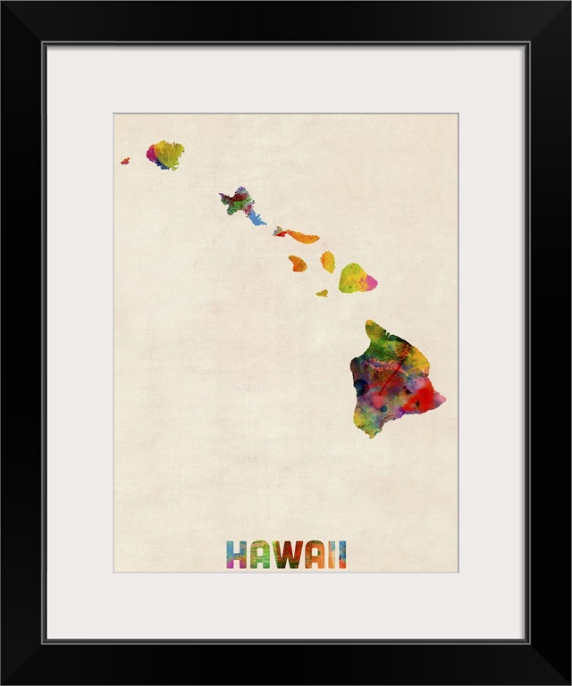 <p>Contemporary piece of artwork of a map of Hawaii made up of watercolor splashes.</p>