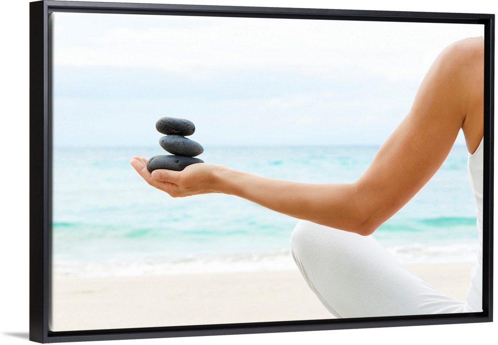 <p>Photograph taken from behind a woman as she sits on the beach with her legs crossed and stretches out one arm holding a small stack of rocks.</p>