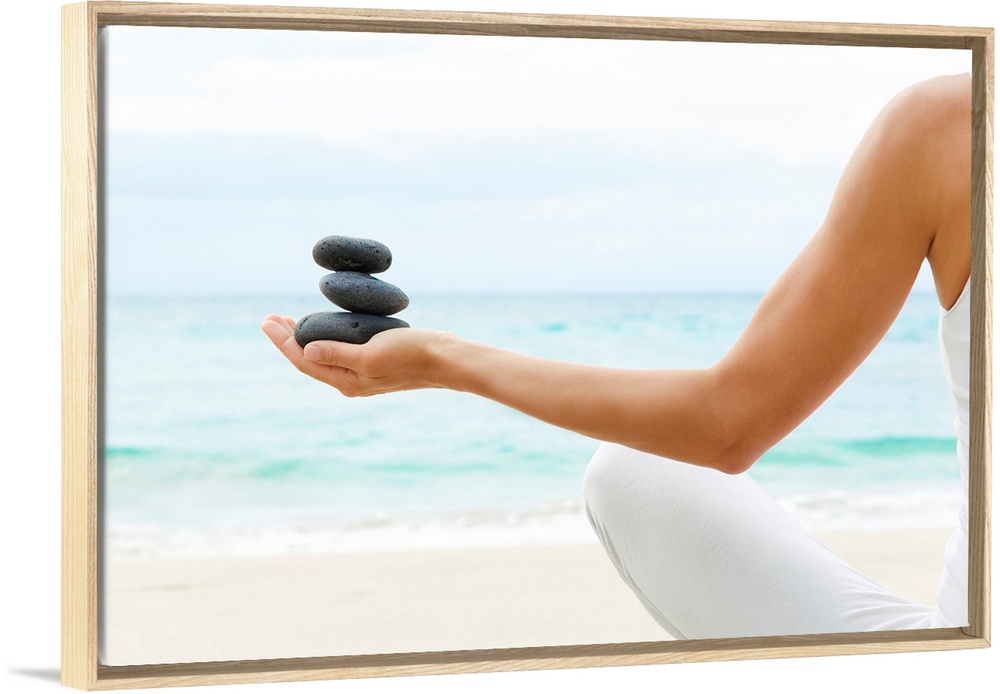 <p>Photograph taken from behind a woman as she sits on the beach with her legs crossed and stretches out one arm holding a small stack of rocks.</p>