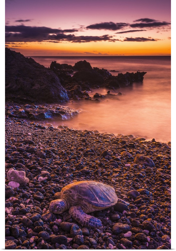 <p>Hawaiian green sea turtle on a lava beach at sunset, Kohala Coast, The Big Island, Hawaii</p>