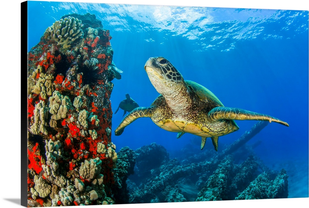 <p>Hawaiian Green sea turtle (Chelonia mydas) swimming in clear, blue water; Lahaina, Maui, Hawaii, United States of America.</p>