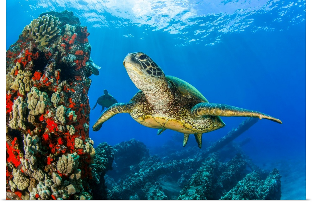 <p>Hawaiian Green sea turtle (Chelonia mydas) swimming in clear, blue water; Lahaina, Maui, Hawaii, United States of America.</p>
