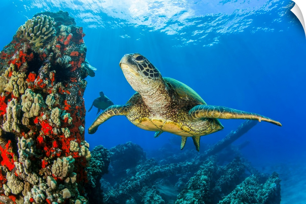 <p>Hawaiian Green sea turtle (Chelonia mydas) swimming in clear, blue water; Lahaina, Maui, Hawaii, United States of America.</p>