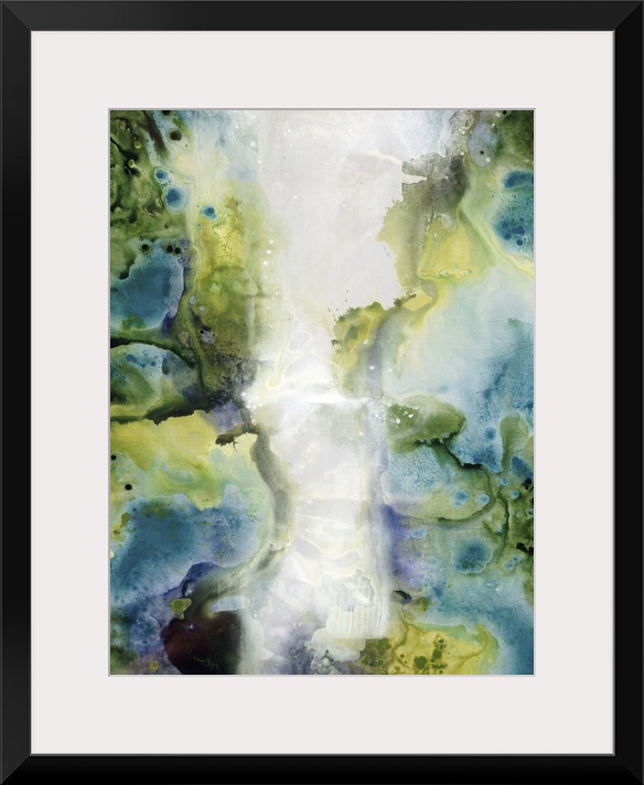 <p>Contemporary abstract painting using muted green and blue tones resembling smoke against a neutral background.</p>