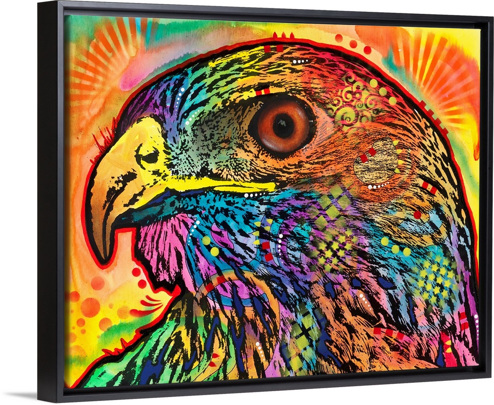 <p>Close-up illustration of a hawk covered in colorful designs.</p>