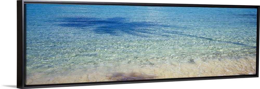 <p>Panoramic photograph of crystal clear ocean water at shoreline with the shadow of palm tree reflecting in it.</p>