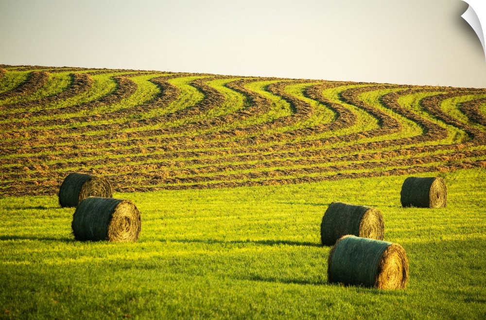 <p>Hay bales in a green field with curvy harvest lines on a rolling hillside in the background, West of Calgary; Alberta, Canada</p>