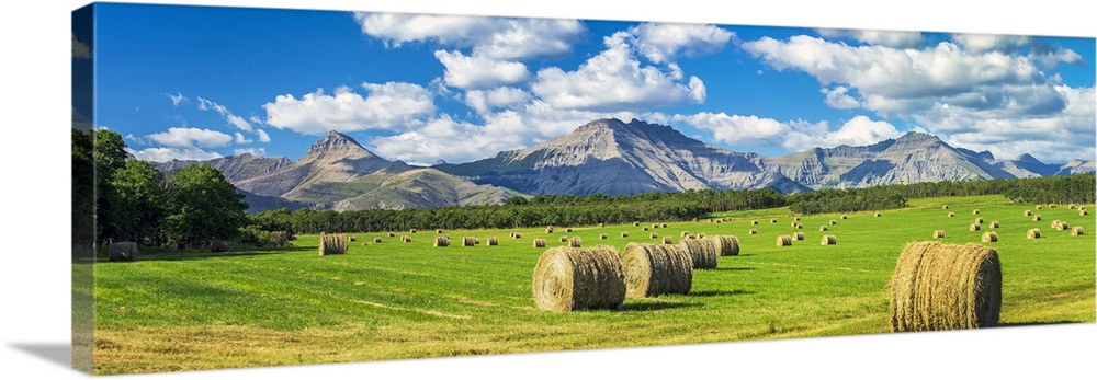 <p>Panorama of hay bales in a green field with mountains, blue sky and clouds in the background, North of Waterton; Alberta, Canada.</p>
