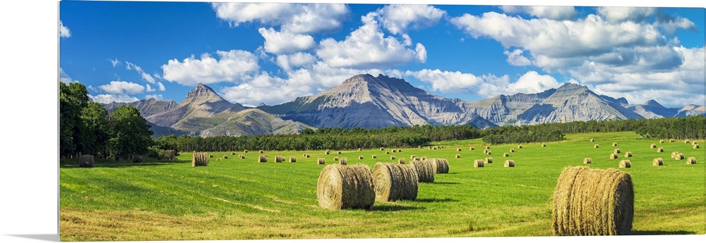 <p>Panorama of hay bales in a green field with mountains, blue sky and clouds in the background, North of Waterton; Alberta, Canada.</p>