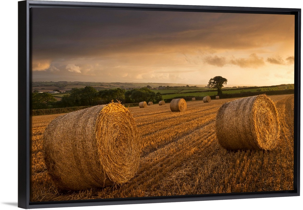 <p>Hay Bales in a ploughed field at sunset, Eastington, Devon, England. Summer (August)</p>