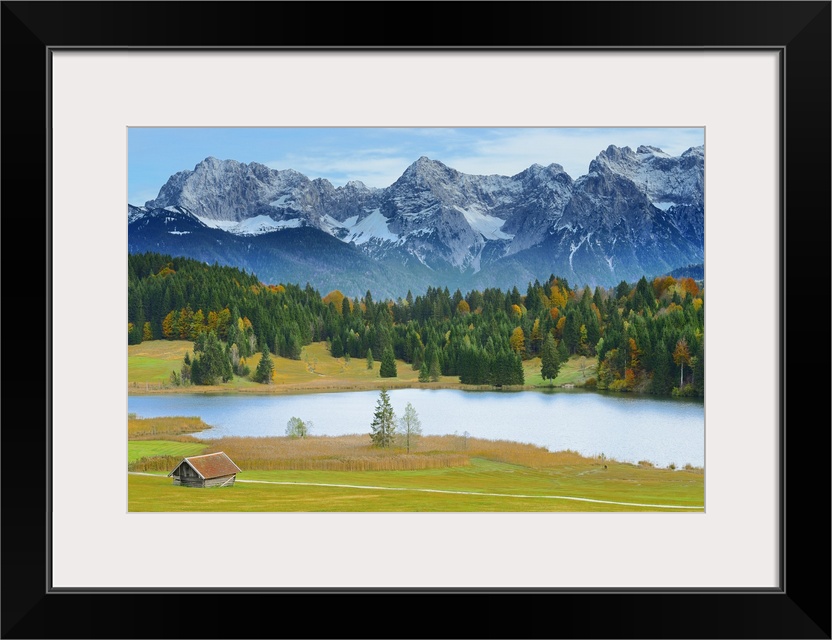 <p>Hay Barn, Lake Geroldsee and Karwendel Mountain Range in Autumn, Werdenfelser Land, Upper Bavaria, Bavaria, Germany</p>
