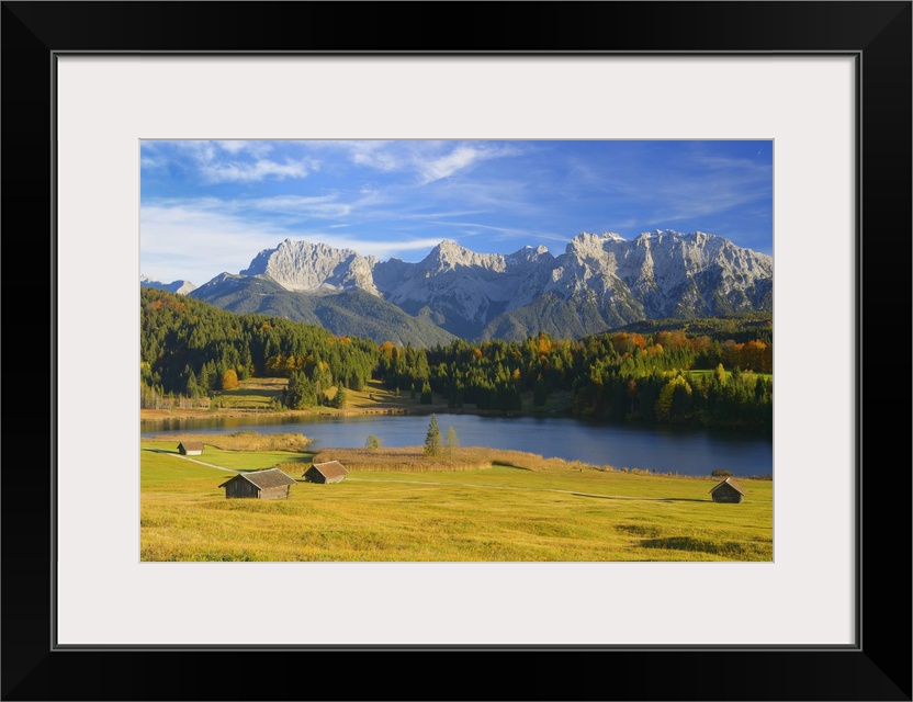 <p>Hay Barns, Lake Geroldsee and Karwendel Mountain Range, near Garmisch-Partenkirchen, Werdenfelser Land, Upper Bavaria, Germany</p>