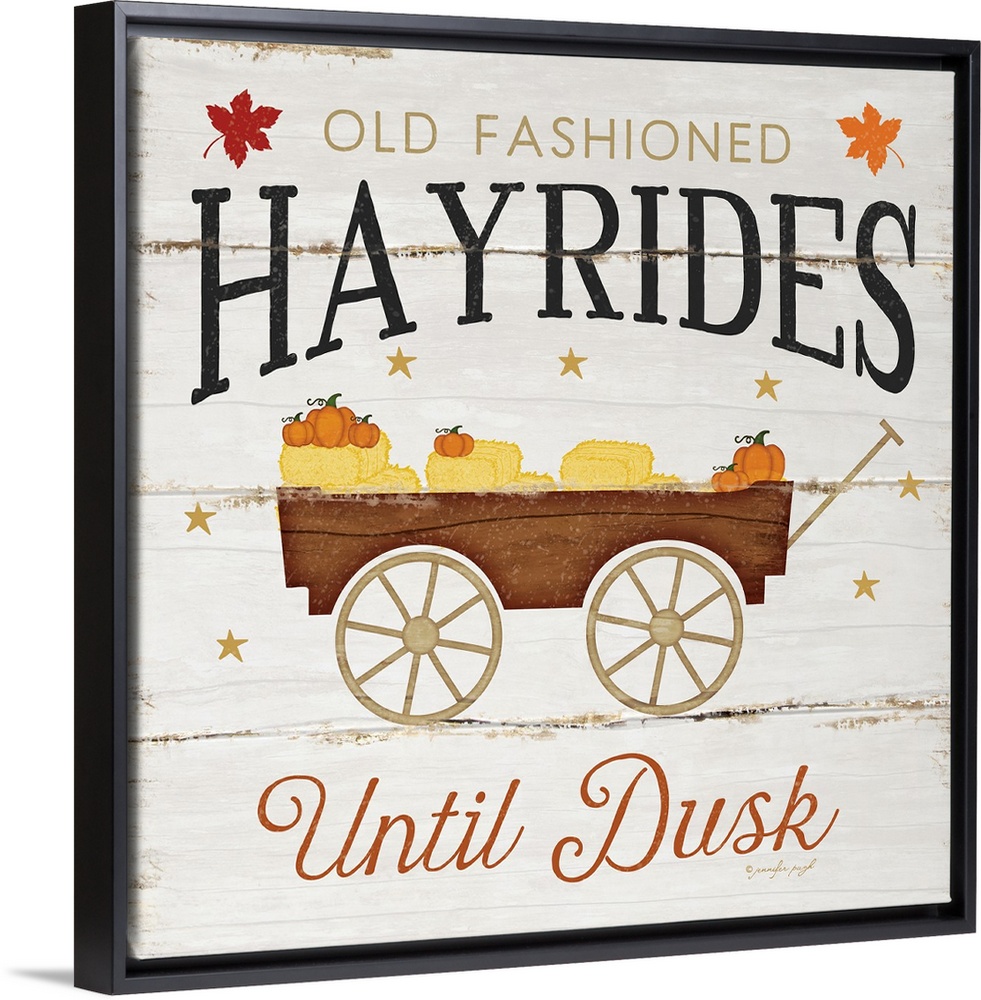 <p>Rustic fall themed decor with the words, "Old fashioned hayrides until dusk" .</p>
